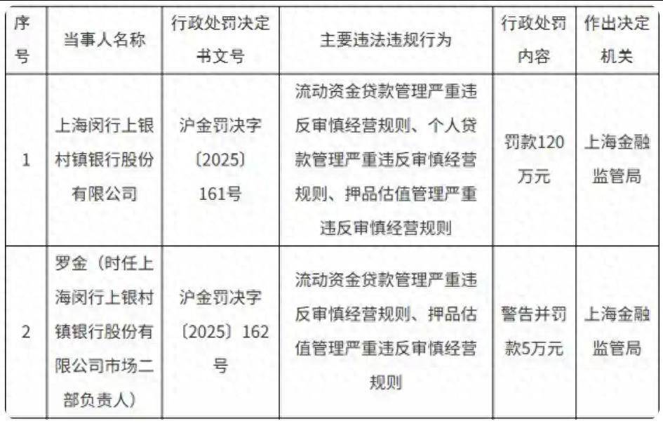 时任上海闵行上银村镇银行市场二部负责人罗金对流动资金贷款管理严重违反审慎经营规则、押品估值管理严重违反审慎经营规则负有责任,被警告并罚款5万元。