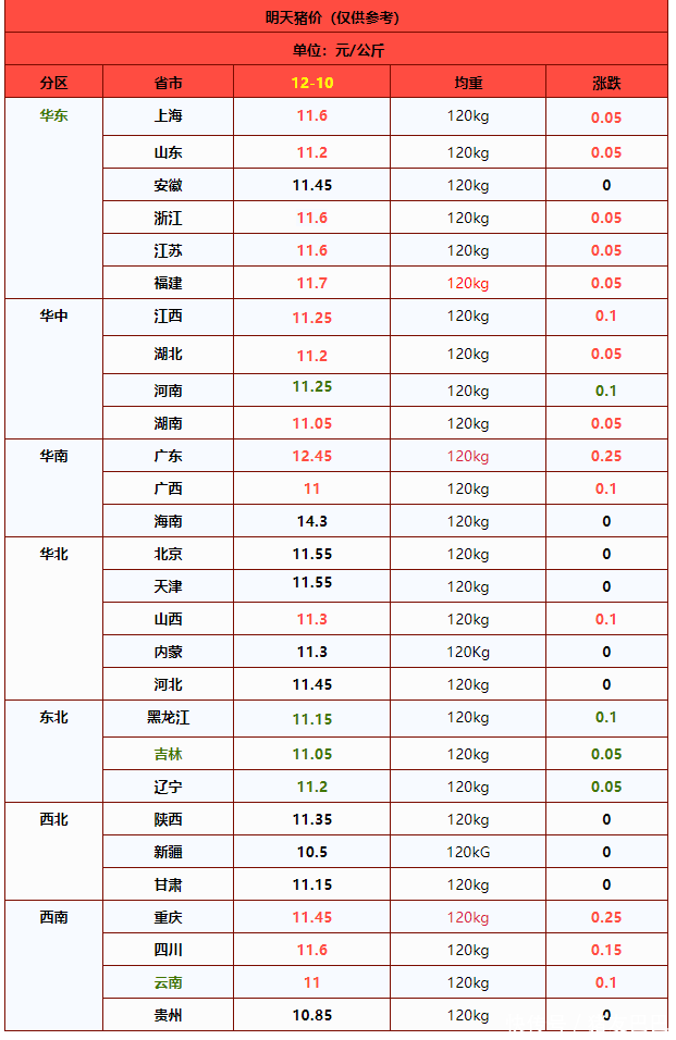 从最新数据显示,受供需变化,个人预估,12月10日,外三元瘦肉型生猪出栏均价在11.44元/公斤,猪价以盘整偏强为主,北方地区,猪价下跌现象增多,南方报价仍以偏强为主!后市关注新一轮冷空气影响下,南方腌腊表现,市场对于猪肉需求的变化!